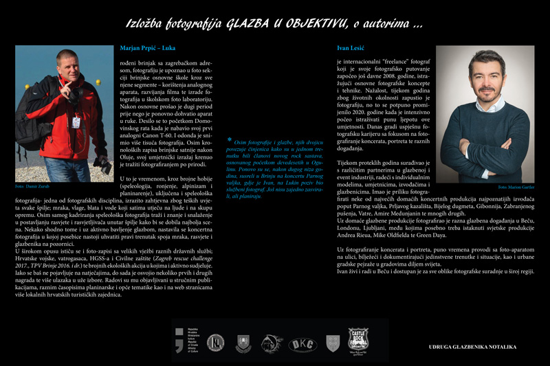 Uvod u bogati glazbeni tjedan 14. Castle rock festivala započeo je otvorenjem izložbe koncertnih fotografija pod nazivom „Glazba u objektivu“. Autori izložbe su Ivan Lesić i Marjan Prpić koji su, uz to što su fotografi, etablirani glazbenici koji su jednom čak i zajedno svirali u istom rock sastavu. Pedeset i pet izabranih fotografija tek je maleni rezime njihovih višegodišnjih hodočašćenja po koncertima; od klubova, velikih dvorana te ulicama hrvatskih i europskih gradova. Svaka fotografija ima svoju vizualnu priču u kojoj, kako autori ističu, glazbu možda nećete čuti, ali ćete je svakako osjetiti. Izložba je bila postavljena u DKC-u Brinje od 07.-13. srpnja, a zbog pokazanog interesa postav je produžen do 20. srpnja.